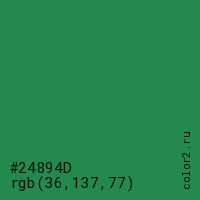 Цвет #24894D в цветовой модели RGB обозначается тремя октетами (36, 137, 77) в десятичном формате и #24894D в шестнадцатиричном (hex) формате, которые являются интенсивностью красного 36 (hex 24), интенсивность зелёного 137 (hex 89) и интенсивность синего 77 (hex 4D).