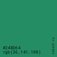 Цвет #248D64 в цветовой модели RGB обозначается тремя октетами (36, 141, 100) в десятичном формате и #248D64 в шестнадцатиричном (hex) формате, которые являются интенсивностью красного 36 (hex 24), интенсивность зелёного 141 (hex 8D) и интенсивность синего 100 (hex 64).