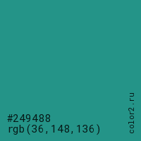 Цвет #249488 в цветовой модели RGB обозначается тремя октетами (36, 148, 136) в десятичном формате и #249488 в шестнадцатиричном (hex) формате, которые являются интенсивностью красного 36 (hex 24), интенсивность зелёного 148 (hex 94) и интенсивность синего 136 (hex 88).