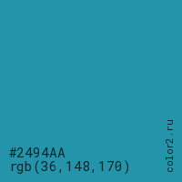 Цвет #2494AA в цветовой модели RGB обозначается тремя октетами (36, 148, 170) в десятичном формате и #2494AA в шестнадцатиричном (hex) формате, которые являются интенсивностью красного 36 (hex 24), интенсивность зелёного 148 (hex 94) и интенсивность синего 170 (hex AA).