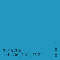 Цвет #2497C0 в цветовой модели RGB обозначается тремя октетами (36, 151, 192) в десятичном формате и #2497C0 в шестнадцатиричном (hex) формате, которые являются интенсивностью красного 36 (hex 24), интенсивность зелёного 151 (hex 97) и интенсивность синего 192 (hex C0).