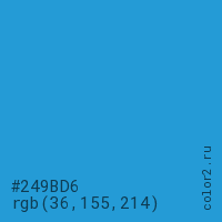 Цвет #249BD6 в цветовой модели RGB обозначается тремя октетами (36, 155, 214) в десятичном формате и #249BD6 в шестнадцатиричном (hex) формате, которые являются интенсивностью красного 36 (hex 24), интенсивность зелёного 155 (hex 9B) и интенсивность синего 214 (hex D6).