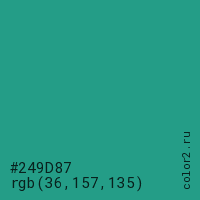 Цвет #249D87 в цветовой модели RGB обозначается тремя октетами (36, 157, 135) в десятичном формате и #249D87 в шестнадцатиричном (hex) формате, которые являются интенсивностью красного 36 (hex 24), интенсивность зелёного 157 (hex 9D) и интенсивность синего 135 (hex 87).
