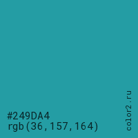 Цвет #249DA4 в цветовой модели RGB обозначается тремя октетами (36, 157, 164) в десятичном формате и #249DA4 в шестнадцатиричном (hex) формате, которые являются интенсивностью красного 36 (hex 24), интенсивность зелёного 157 (hex 9D) и интенсивность синего 164 (hex A4).