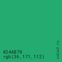 Цвет #24AB70 в цветовой модели RGB обозначается тремя октетами (36, 171, 112) в десятичном формате и #24AB70 в шестнадцатиричном (hex) формате, которые являются интенсивностью красного 36 (hex 24), интенсивность зелёного 171 (hex AB) и интенсивность синего 112 (hex 70).