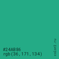 Цвет #24AB86 в цветовой модели RGB обозначается тремя октетами (36, 171, 134) в десятичном формате и #24AB86 в шестнадцатиричном (hex) формате, которые являются интенсивностью красного 36 (hex 24), интенсивность зелёного 171 (hex AB) и интенсивность синего 134 (hex 86).