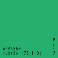 Цвет #24AF6E в цветовой модели RGB обозначается тремя октетами (36, 175, 110) в десятичном формате и #24AF6E в шестнадцатиричном (hex) формате, которые являются интенсивностью красного 36 (hex 24), интенсивность зелёного 175 (hex AF) и интенсивность синего 110 (hex 6E).