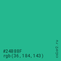 Цвет #24B88F в цветовой модели RGB обозначается тремя октетами (36, 184, 143) в десятичном формате и #24B88F в шестнадцатиричном (hex) формате, которые являются интенсивностью красного 36 (hex 24), интенсивность зелёного 184 (hex B8) и интенсивность синего 143 (hex 8F).