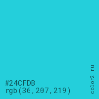 Цвет #24CFDB в цветовой модели RGB обозначается тремя октетами (36, 207, 219) в десятичном формате и #24CFDB в шестнадцатиричном (hex) формате, которые являются интенсивностью красного 36 (hex 24), интенсивность зелёного 207 (hex CF) и интенсивность синего 219 (hex DB).