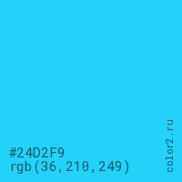 Цвет #24D2F9 в цветовой модели RGB обозначается тремя октетами (36, 210, 249) в десятичном формате и #24D2F9 в шестнадцатиричном (hex) формате, которые являются интенсивностью красного 36 (hex 24), интенсивность зелёного 210 (hex D2) и интенсивность синего 249 (hex F9).