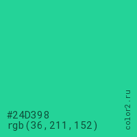 Цвет #24D398 в цветовой модели RGB обозначается тремя октетами (36, 211, 152) в десятичном формате и #24D398 в шестнадцатиричном (hex) формате, которые являются интенсивностью красного 36 (hex 24), интенсивность зелёного 211 (hex D3) и интенсивность синего 152 (hex 98).