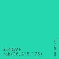 Цвет #24D7AF в цветовой модели RGB обозначается тремя октетами (36, 215, 175) в десятичном формате и #24D7AF в шестнадцатиричном (hex) формате, которые являются интенсивностью красного 36 (hex 24), интенсивность зелёного 215 (hex D7) и интенсивность синего 175 (hex AF).