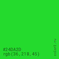 Цвет #24DA2D в цветовой модели RGB обозначается тремя октетами (36, 218, 45) в десятичном формате и #24DA2D в шестнадцатиричном (hex) формате, которые являются интенсивностью красного 36 (hex 24), интенсивность зелёного 218 (hex DA) и интенсивность синего 45 (hex 2D).