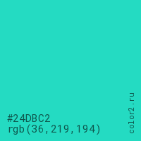 Цвет #24DBC2 в цветовой модели RGB обозначается тремя октетами (36, 219, 194) в десятичном формате и #24DBC2 в шестнадцатиричном (hex) формате, которые являются интенсивностью красного 36 (hex 24), интенсивность зелёного 219 (hex DB) и интенсивность синего 194 (hex C2).