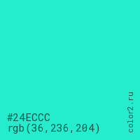 Цвет #24ECCC в цветовой модели RGB обозначается тремя октетами (36, 236, 204) в десятичном формате и #24ECCC в шестнадцатиричном (hex) формате, которые являются интенсивностью красного 36 (hex 24), интенсивность зелёного 236 (hex EC) и интенсивность синего 204 (hex CC).