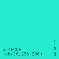 Цвет #24ECCE в цветовой модели RGB обозначается тремя октетами (36, 236, 206) в десятичном формате и #24ECCE в шестнадцатиричном (hex) формате, которые являются интенсивностью красного 36 (hex 24), интенсивность зелёного 236 (hex EC) и интенсивность синего 206 (hex CE).