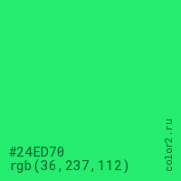Цвет #24ED70 в цветовой модели RGB обозначается тремя октетами (36, 237, 112) в десятичном формате и #24ED70 в шестнадцатиричном (hex) формате, которые являются интенсивностью красного 36 (hex 24), интенсивность зелёного 237 (hex ED) и интенсивность синего 112 (hex 70).