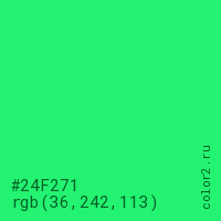 Цвет #24F271 в цветовой модели RGB обозначается тремя октетами (36, 242, 113) в десятичном формате и #24F271 в шестнадцатиричном (hex) формате, которые являются интенсивностью красного 36 (hex 24), интенсивность зелёного 242 (hex F2) и интенсивность синего 113 (hex 71).