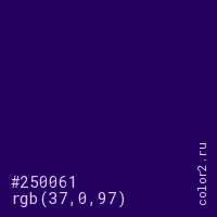 Цвет #250061 в цветовой модели RGB обозначается тремя октетами (37, 0, 97) в десятичном формате и #250061 в шестнадцатиричном (hex) формате, которые являются интенсивностью красного 37 (hex 25), интенсивность зелёного 0 (hex 00) и интенсивность синего 97 (hex 61).