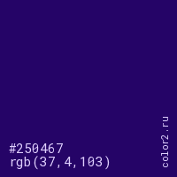 Цвет #250467 в цветовой модели RGB обозначается тремя октетами (37, 4, 103) в десятичном формате и #250467 в шестнадцатиричном (hex) формате, которые являются интенсивностью красного 37 (hex 25), интенсивность зелёного 4 (hex 04) и интенсивность синего 103 (hex 67).
