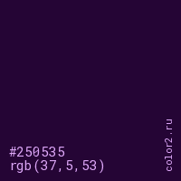 Цвет #250535 в цветовой модели RGB обозначается тремя октетами (37, 5, 53) в десятичном формате и #250535 в шестнадцатиричном (hex) формате, которые являются интенсивностью красного 37 (hex 25), интенсивность зелёного 5 (hex 05) и интенсивность синего 53 (hex 35).
