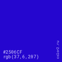 Цвет #2506CF в цветовой модели RGB обозначается тремя октетами (37, 6, 207) в десятичном формате и #2506CF в шестнадцатиричном (hex) формате, которые являются интенсивностью красного 37 (hex 25), интенсивность зелёного 6 (hex 06) и интенсивность синего 207 (hex CF).
