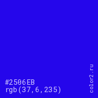 Цвет #2506EB в цветовой модели RGB обозначается тремя октетами (37, 6, 235) в десятичном формате и #2506EB в шестнадцатиричном (hex) формате, которые являются интенсивностью красного 37 (hex 25), интенсивность зелёного 6 (hex 06) и интенсивность синего 235 (hex EB).