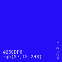 Цвет #250DF8 в цветовой модели RGB обозначается тремя октетами (37, 13, 248) в десятичном формате и #250DF8 в шестнадцатиричном (hex) формате, которые являются интенсивностью красного 37 (hex 25), интенсивность зелёного 13 (hex 0D) и интенсивность синего 248 (hex F8).