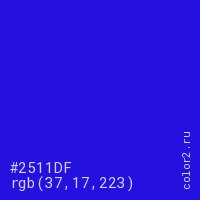 Цвет #2511DF в цветовой модели RGB обозначается тремя октетами (37, 17, 223) в десятичном формате и #2511DF в шестнадцатиричном (hex) формате, которые являются интенсивностью красного 37 (hex 25), интенсивность зелёного 17 (hex 11) и интенсивность синего 223 (hex DF).