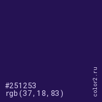 Цвет #251253 в цветовой модели RGB обозначается тремя октетами (37, 18, 83) в десятичном формате и #251253 в шестнадцатиричном (hex) формате, которые являются интенсивностью красного 37 (hex 25), интенсивность зелёного 18 (hex 12) и интенсивность синего 83 (hex 53).