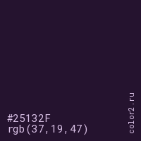 Цвет #25132F в цветовой модели RGB обозначается тремя октетами (37, 19, 47) в десятичном формате и #25132F в шестнадцатиричном (hex) формате, которые являются интенсивностью красного 37 (hex 25), интенсивность зелёного 19 (hex 13) и интенсивность синего 47 (hex 2F).
