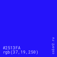 Цвет #2513FA в цветовой модели RGB обозначается тремя октетами (37, 19, 250) в десятичном формате и #2513FA в шестнадцатиричном (hex) формате, которые являются интенсивностью красного 37 (hex 25), интенсивность зелёного 19 (hex 13) и интенсивность синего 250 (hex FA).