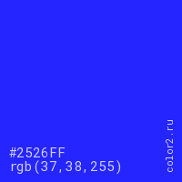 Цвет #2526FF в цветовой модели RGB обозначается тремя октетами (37, 38, 255) в десятичном формате и #2526FF в шестнадцатиричном (hex) формате, которые являются интенсивностью красного 37 (hex 25), интенсивность зелёного 38 (hex 26) и интенсивность синего 255 (hex FF).