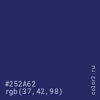 Цвет #252A62 в цветовой модели RGB обозначается тремя октетами (37, 42, 98) в десятичном формате и #252A62 в шестнадцатиричном (hex) формате, которые являются интенсивностью красного 37 (hex 25), интенсивность зелёного 42 (hex 2A) и интенсивность синего 98 (hex 62).