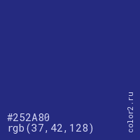 Цвет #252A80 в цветовой модели RGB обозначается тремя октетами (37, 42, 128) в десятичном формате и #252A80 в шестнадцатиричном (hex) формате, которые являются интенсивностью красного 37 (hex 25), интенсивность зелёного 42 (hex 2A) и интенсивность синего 128 (hex 80).