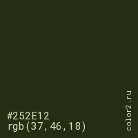 Цвет #252E12 в цветовой модели RGB обозначается тремя октетами (37, 46, 18) в десятичном формате и #252E12 в шестнадцатиричном (hex) формате, которые являются интенсивностью красного 37 (hex 25), интенсивность зелёного 46 (hex 2E) и интенсивность синего 18 (hex 12).