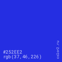 Цвет #252EE2 в цветовой модели RGB обозначается тремя октетами (37, 46, 226) в десятичном формате и #252EE2 в шестнадцатиричном (hex) формате, которые являются интенсивностью красного 37 (hex 25), интенсивность зелёного 46 (hex 2E) и интенсивность синего 226 (hex E2).