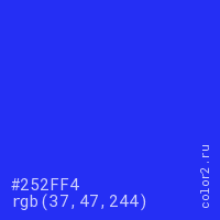 Цвет #252FF4 в цветовой модели RGB обозначается тремя октетами (37, 47, 244) в десятичном формате и #252FF4 в шестнадцатиричном (hex) формате, которые являются интенсивностью красного 37 (hex 25), интенсивность зелёного 47 (hex 2F) и интенсивность синего 244 (hex F4).