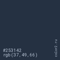 Цвет #253142 в цветовой модели RGB обозначается тремя октетами (37, 49, 66) в десятичном формате и #253142 в шестнадцатиричном (hex) формате, которые являются интенсивностью красного 37 (hex 25), интенсивность зелёного 49 (hex 31) и интенсивность синего 66 (hex 42).