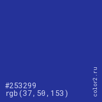 Цвет #253299 в цветовой модели RGB обозначается тремя октетами (37, 50, 153) в десятичном формате и #253299 в шестнадцатиричном (hex) формате, которые являются интенсивностью красного 37 (hex 25), интенсивность зелёного 50 (hex 32) и интенсивность синего 153 (hex 99).