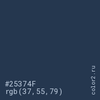 Цвет #25374F в цветовой модели RGB обозначается тремя октетами (37, 55, 79) в десятичном формате и #25374F в шестнадцатиричном (hex) формате, которые являются интенсивностью красного 37 (hex 25), интенсивность зелёного 55 (hex 37) и интенсивность синего 79 (hex 4F).
