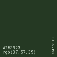 Цвет #253923 в цветовой модели RGB обозначается тремя октетами (37, 57, 35) в десятичном формате и #253923 в шестнадцатиричном (hex) формате, которые являются интенсивностью красного 37 (hex 25), интенсивность зелёного 57 (hex 39) и интенсивность синего 35 (hex 23).