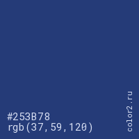 Цвет #253B78 в цветовой модели RGB обозначается тремя октетами (37, 59, 120) в десятичном формате и #253B78 в шестнадцатиричном (hex) формате, которые являются интенсивностью красного 37 (hex 25), интенсивность зелёного 59 (hex 3B) и интенсивность синего 120 (hex 78).