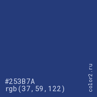 Цвет #253B7A в цветовой модели RGB обозначается тремя октетами (37, 59, 122) в десятичном формате и #253B7A в шестнадцатиричном (hex) формате, которые являются интенсивностью красного 37 (hex 25), интенсивность зелёного 59 (hex 3B) и интенсивность синего 122 (hex 7A).