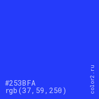 Цвет #253BFA в цветовой модели RGB обозначается тремя октетами (37, 59, 250) в десятичном формате и #253BFA в шестнадцатиричном (hex) формате, которые являются интенсивностью красного 37 (hex 25), интенсивность зелёного 59 (hex 3B) и интенсивность синего 250 (hex FA).