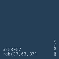 Цвет #253F57 в цветовой модели RGB обозначается тремя октетами (37, 63, 87) в десятичном формате и #253F57 в шестнадцатиричном (hex) формате, которые являются интенсивностью красного 37 (hex 25), интенсивность зелёного 63 (hex 3F) и интенсивность синего 87 (hex 57).