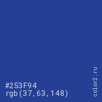 Цвет #253F94 в цветовой модели RGB обозначается тремя октетами (37, 63, 148) в десятичном формате и #253F94 в шестнадцатиричном (hex) формате, которые являются интенсивностью красного 37 (hex 25), интенсивность зелёного 63 (hex 3F) и интенсивность синего 148 (hex 94).