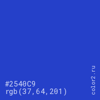 Цвет #2540C9 в цветовой модели RGB обозначается тремя октетами (37, 64, 201) в десятичном формате и #2540C9 в шестнадцатиричном (hex) формате, которые являются интенсивностью красного 37 (hex 25), интенсивность зелёного 64 (hex 40) и интенсивность синего 201 (hex C9).