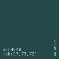 Цвет #254948 в цветовой модели RGB обозначается тремя октетами (37, 73, 72) в десятичном формате и #254948 в шестнадцатиричном (hex) формате, которые являются интенсивностью красного 37 (hex 25), интенсивность зелёного 73 (hex 49) и интенсивность синего 72 (hex 48).