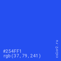 Цвет #254FF1 в цветовой модели RGB обозначается тремя октетами (37, 79, 241) в десятичном формате и #254FF1 в шестнадцатиричном (hex) формате, которые являются интенсивностью красного 37 (hex 25), интенсивность зелёного 79 (hex 4F) и интенсивность синего 241 (hex F1).